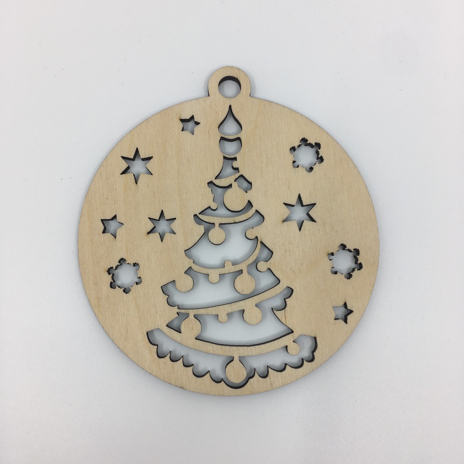 Závěsná ozdoba z březové překližky ve tvaru baňky s vyřezaným ornamentem vánočního stromku. Povrchově neupraveno, takže lze i dotvořit dle vlastní fantazie, ale lze i rovnou použít. Průměr 8 cm.