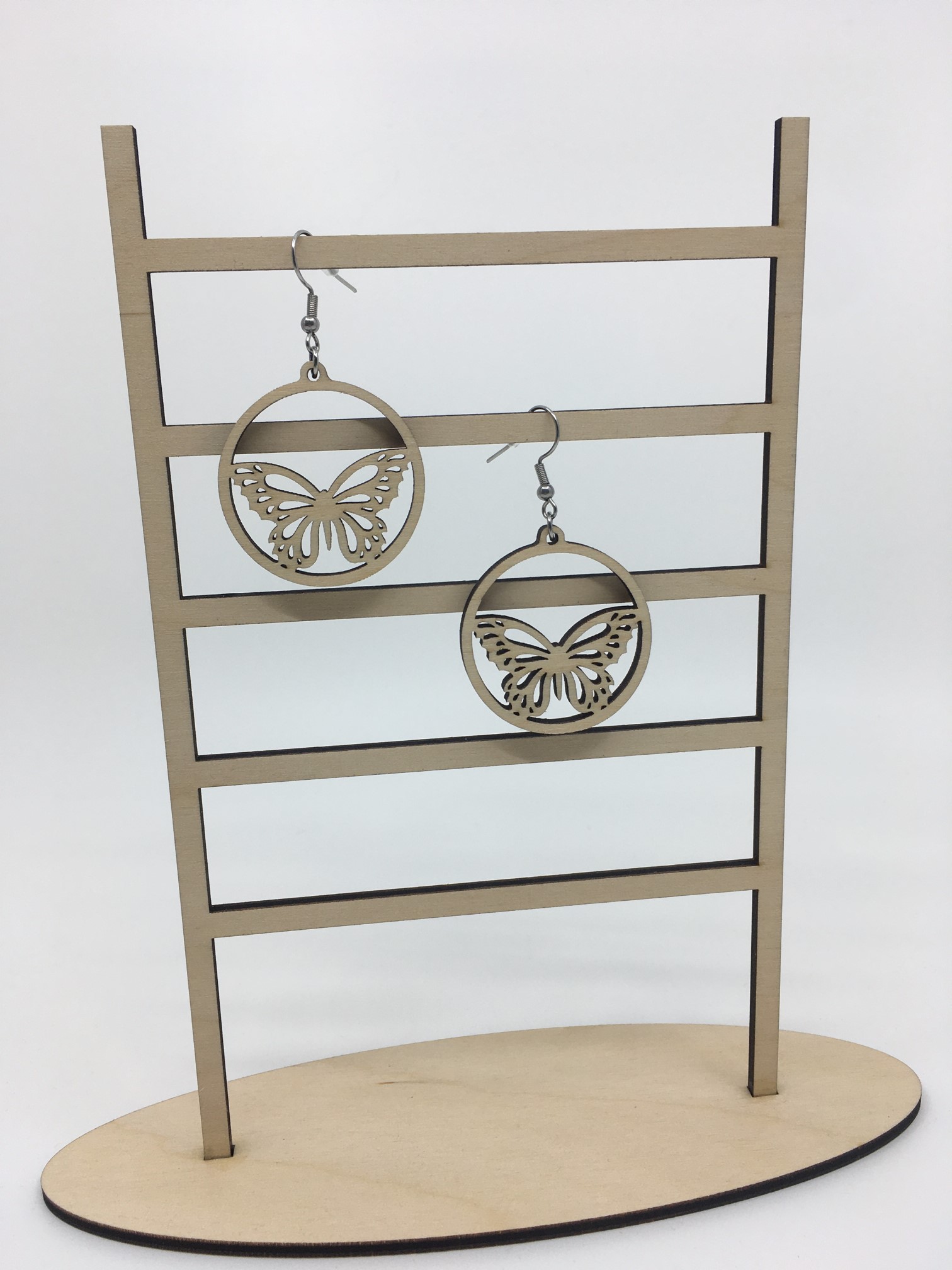 Náušnice z březové překližky (bez povrchové úpravy, lze i dotvořit, ale i rovnou používat), háček z nerez oceli. Průměr náušnic 3 cm.