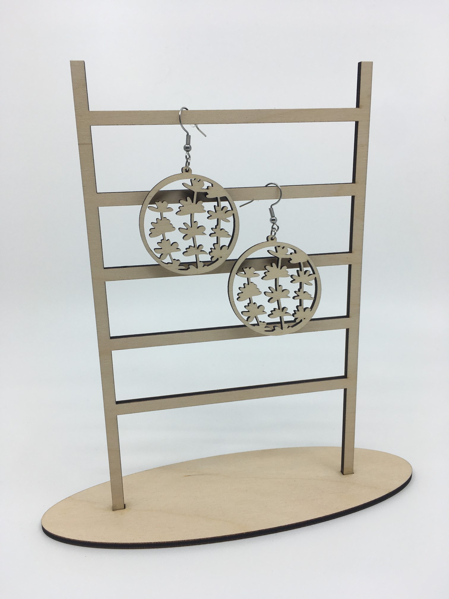 Náušnice z březové překližky (bez povrchové úpravy, lze i dotvořit, ale i rovnou používat), háček z nerez oceli. Průměr náušnic 3,8 cm.