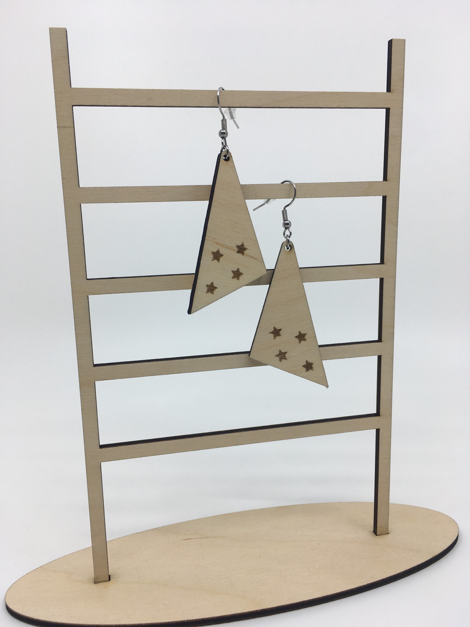 Náušnice z březové překližky (bez povrchové úpravy, lze i dotvořit, ale i rovnou používat), háček z nerez oceli. Délka náušnic 5 cm.