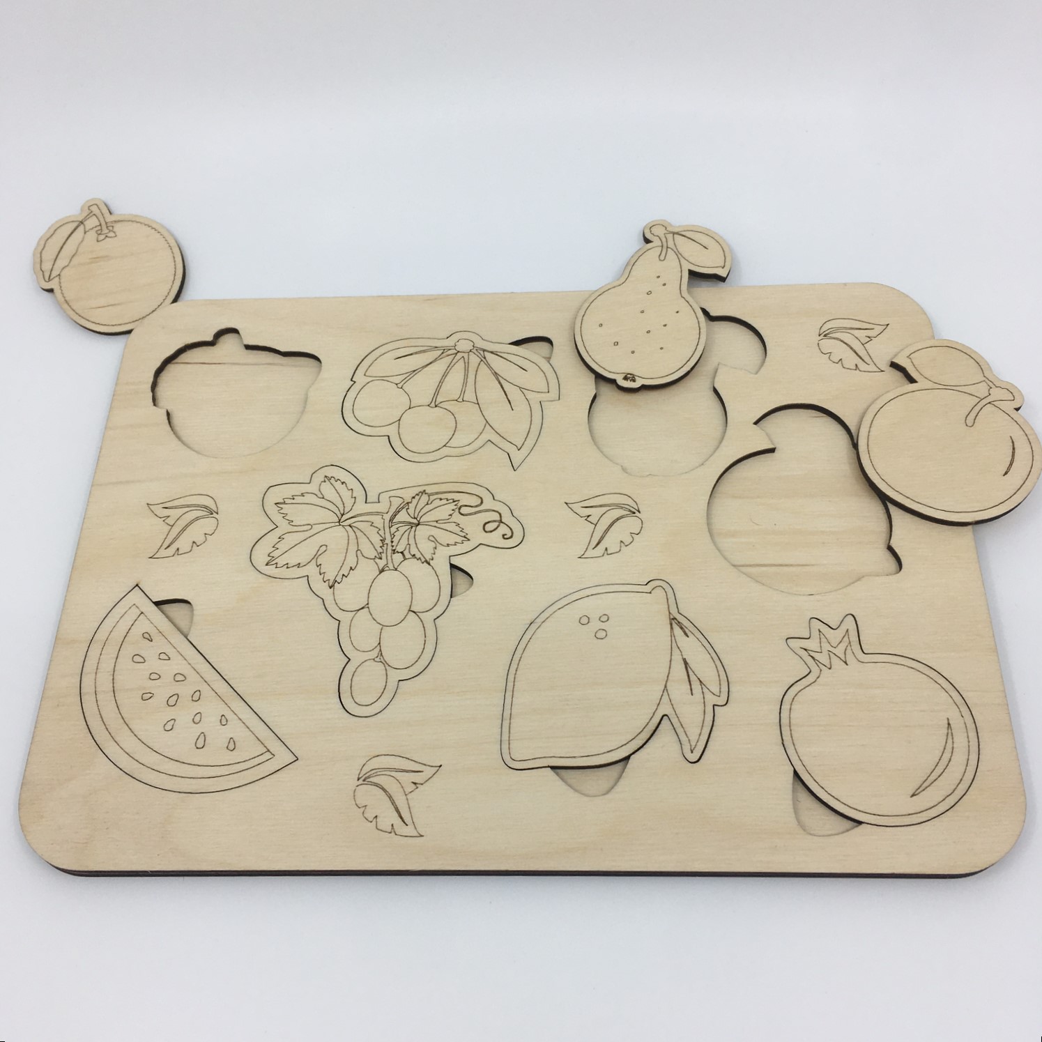 Dřevěná (březová překližka) vkládačka s různými druhy ovoce, rozměr 25 x 18 cm. Povrch není ničím neošetřený, lze dotvořit dle vlastní fantazie, nebo nechat v přírodní podobě. Vkládačka podporuje a rozvíjí jemnou motoriku, přesnost, paměť, orientaci v prostoru.
